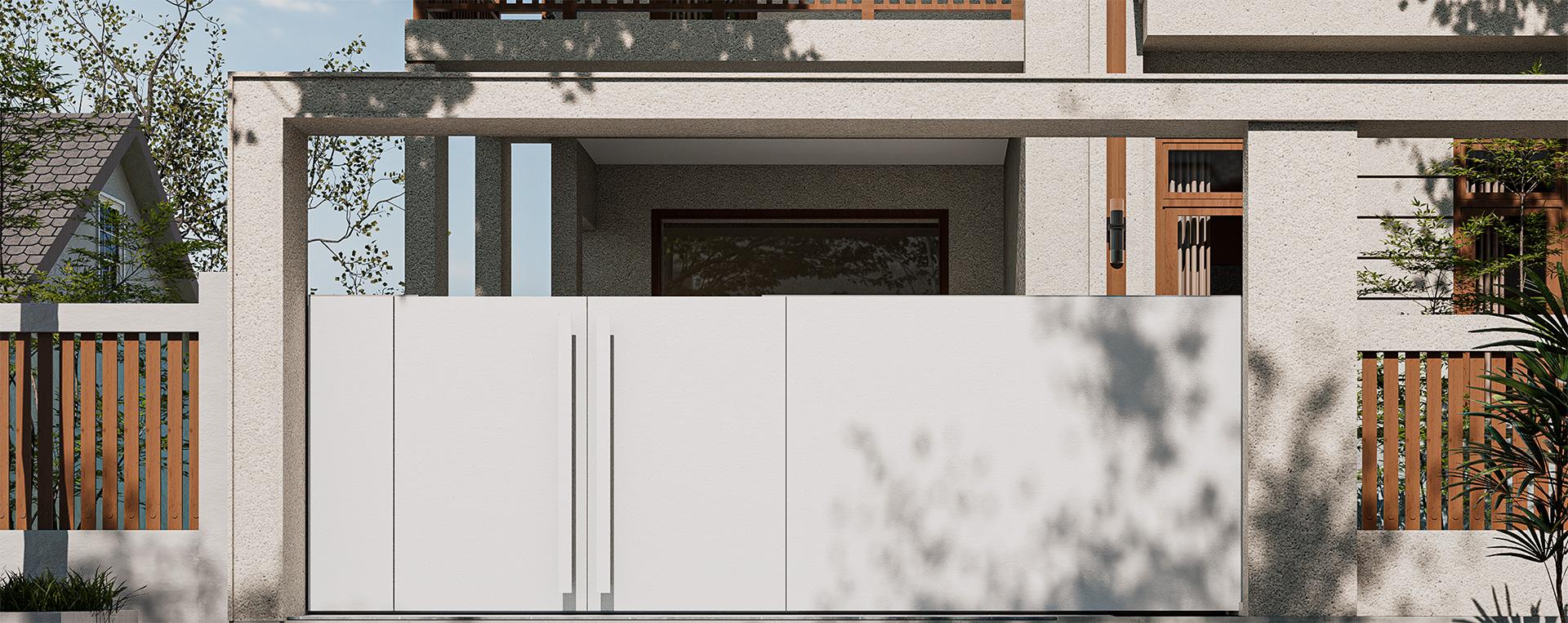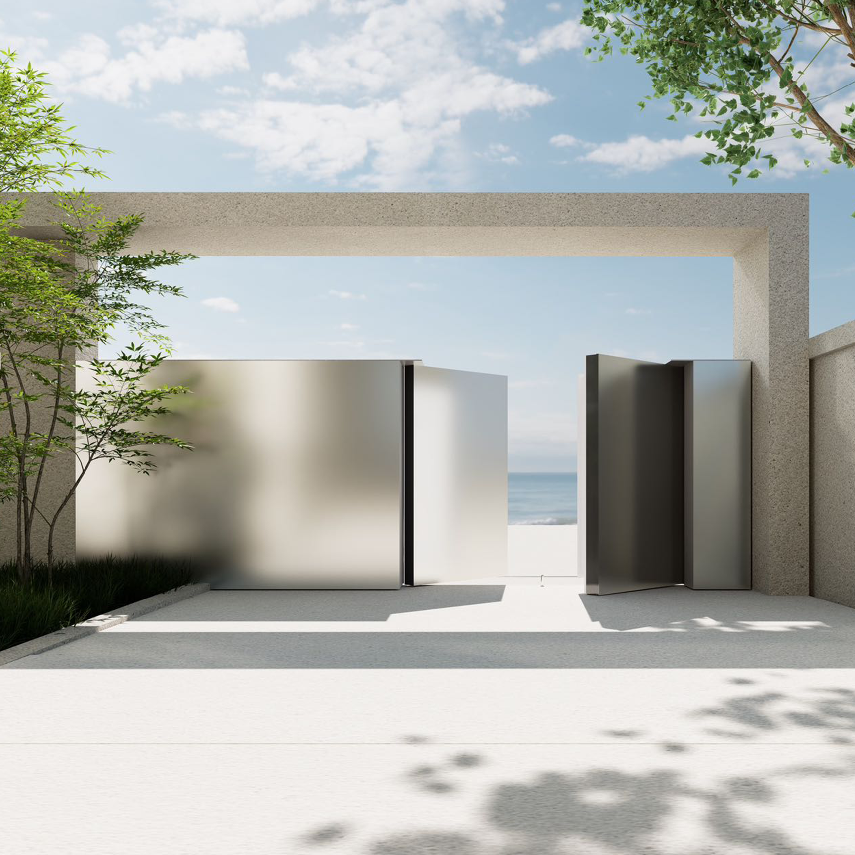 古人有云:”园之佳者如诗之绝句,词之小令,皆以少胜多,不以门扉夺景,而以框景纳胜。"门的存在,不是为了被观看,而是为了更好地观看自然。这扇门,便是这一东方哲思的当代映照,它不争不抢,隐于庭院,唯有光掠过材质之时,门早已与自然共生,成为风景的一部分。外饰面拉法基水泥如同山水画中的留白,退居于繁花绿树之后,反而衬托出庭院景致的鲜活。门内选用独特的苹果砂不锈钢,并非为了闪耀,而是为了“柔化与融合”,它不反射刺目光线,只将阳光温柔过滤,化为庭院景深的一层柔焦滤镜,从而达到“门隐于景,光溶于境”的意境。